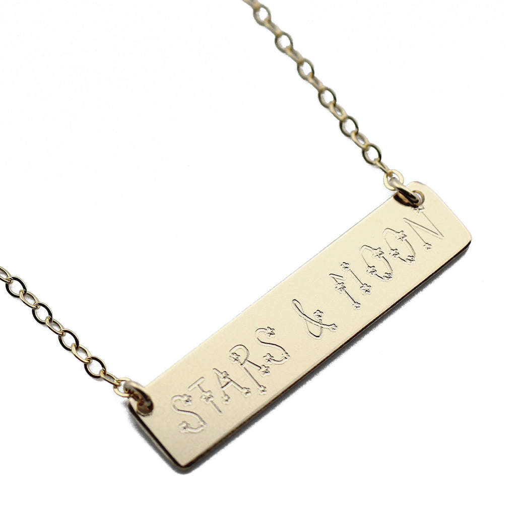 Have you ever wanted your name written in the stars and gold? Well look no further! Have your name or your favorite saying written in the stars! Hand Formed 14K Gold Filled Name Plate Necklace. Suspended on a gorgeous 2mmx1.6mm Flat Cable Chain.